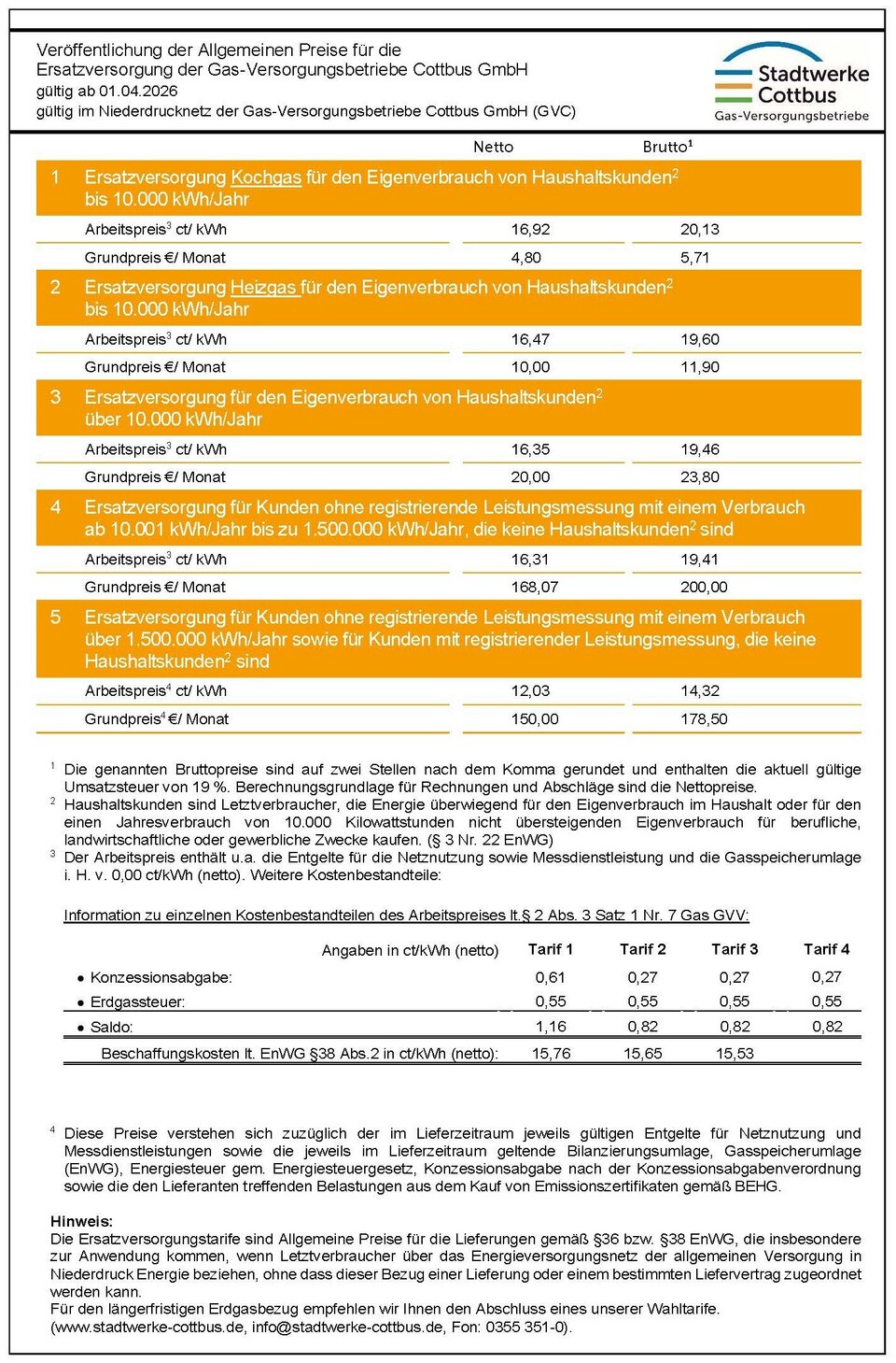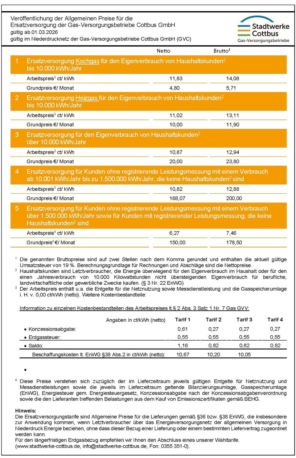Diese Tarife gelten für Kunden, die Erdgas verbrauchen, ohne mit der Gas-Versorgungsbetriebe Cottbus GmbH oder einem anderen Gasversorgungsunternehmen einen Liefervertrag abgeschlossen zu haben.
