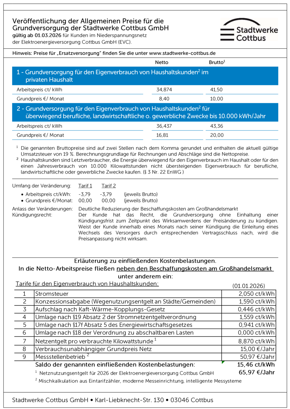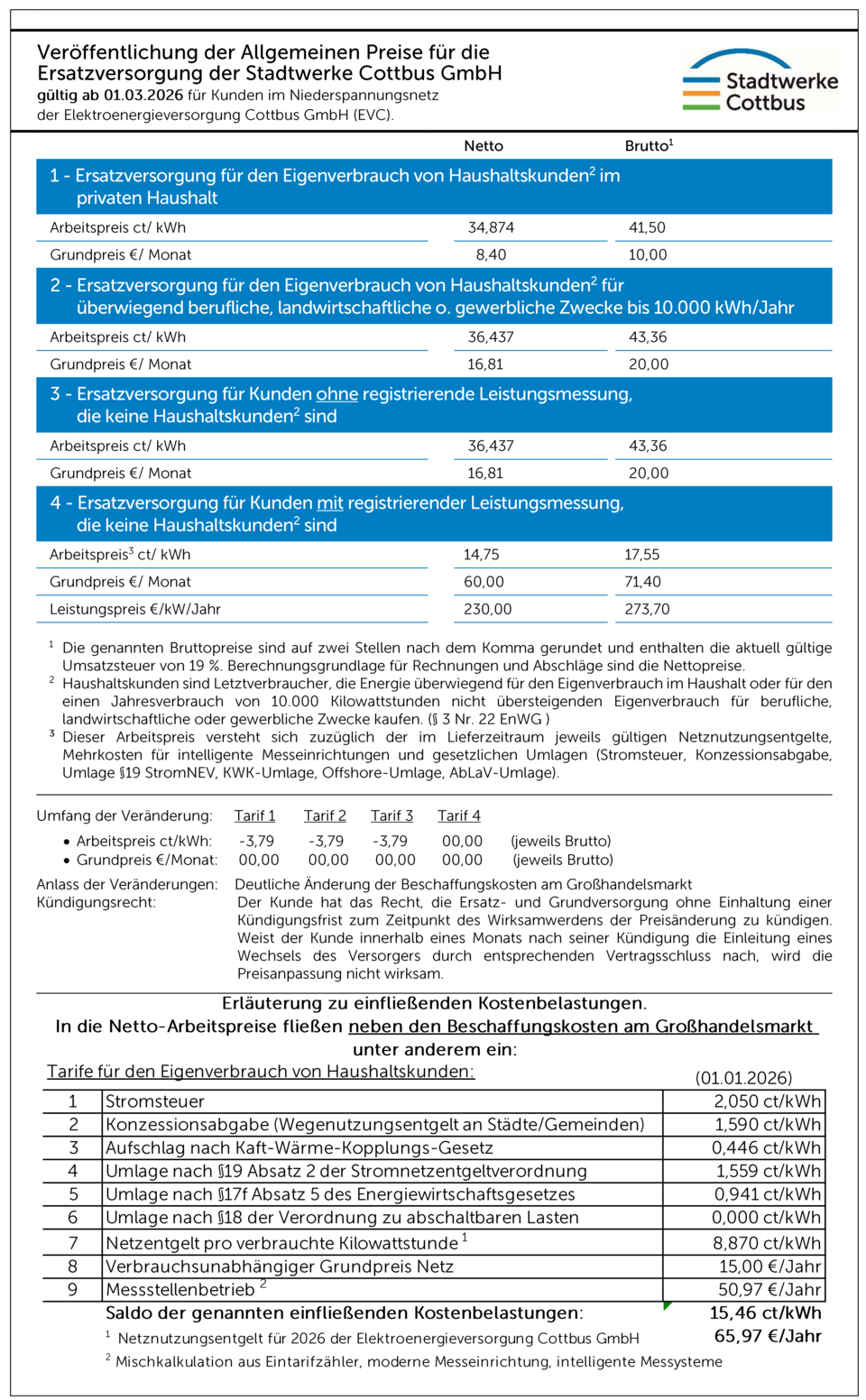 Diese Tarife gelten für Kunden, die Elektroenergie verbrauchen, ohne mit der Stadtwerke Cottbus GmbH oder einem anderen Stromversorgungsunternehmen einen Liefervertrag abgeschlossen zu haben.