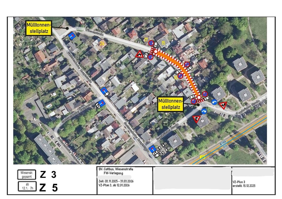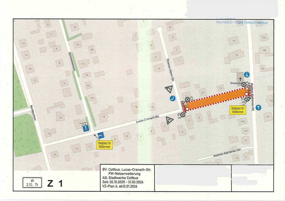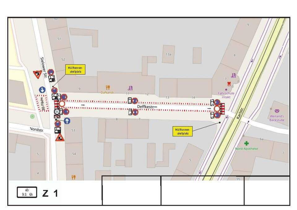 Ab Montag, den 09.03.2026 wird die Deffkestraße von der Sielower Straße bis zur Karlstraße für voraussichtlich acht Wochen komplett gesperrt. Bereits ab Freitag, den 27.02.2026 werden zudem die Wiesenstraße zwischen Saarbrücker Straße und Wiesenstraße 15 sowie die L.-Cranach-Straße zwischen Walther-Rathenau-Straße und Thomas-Mann-Straße ebenfalls für jeweils rund acht Wochen komplett gesperrt.