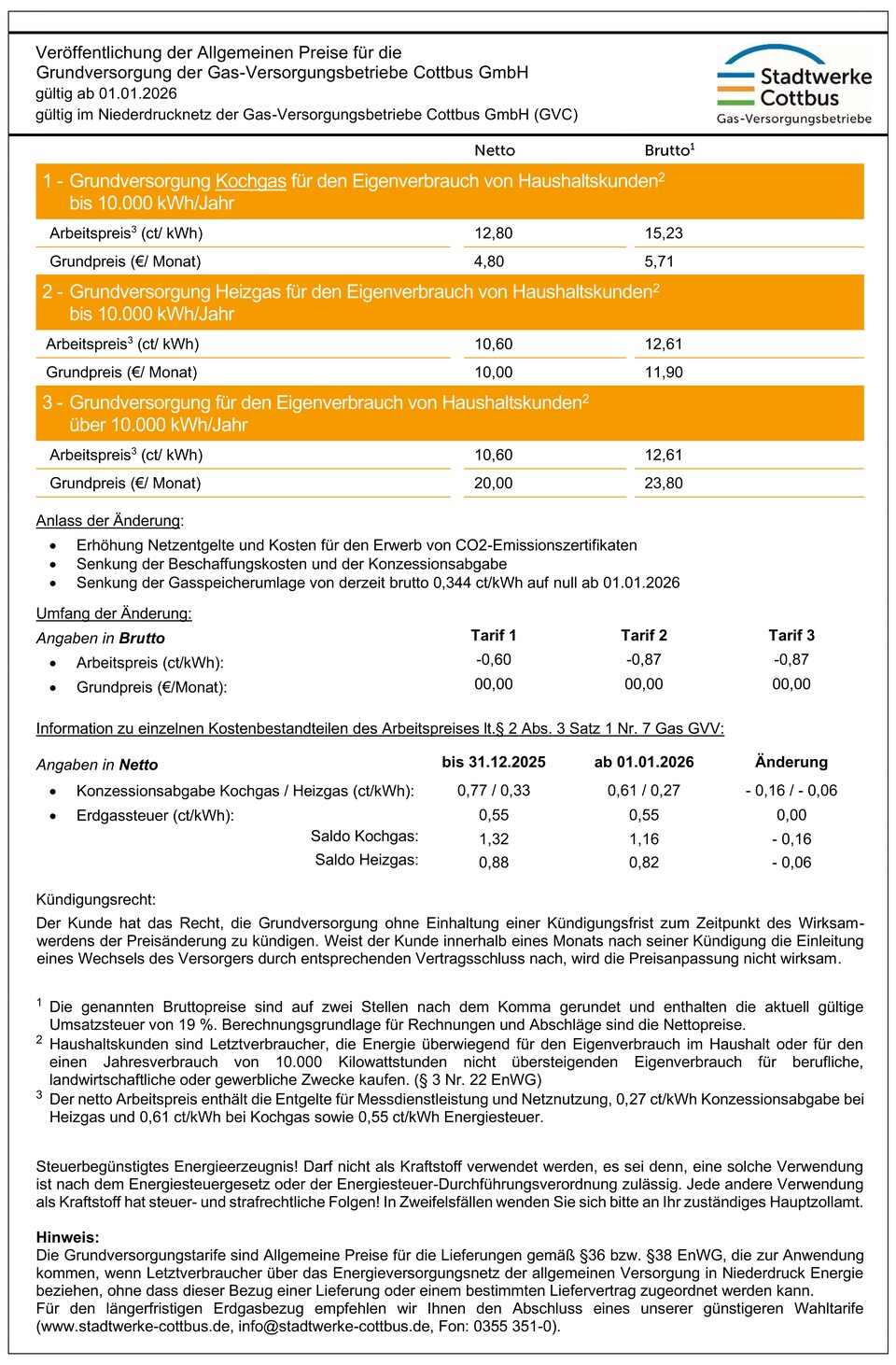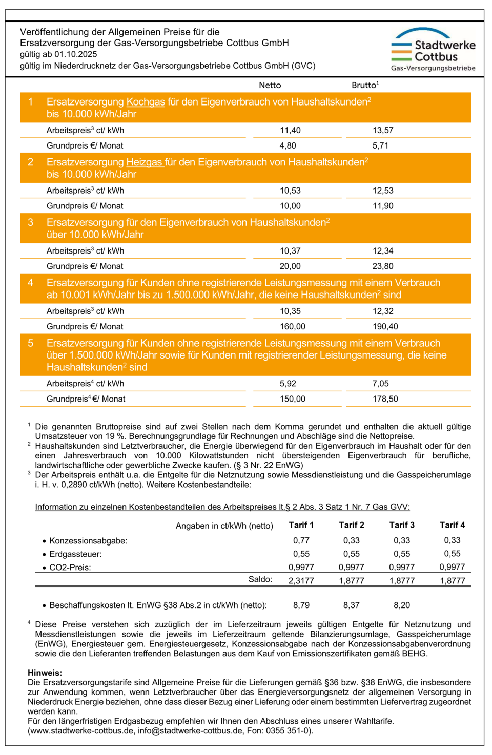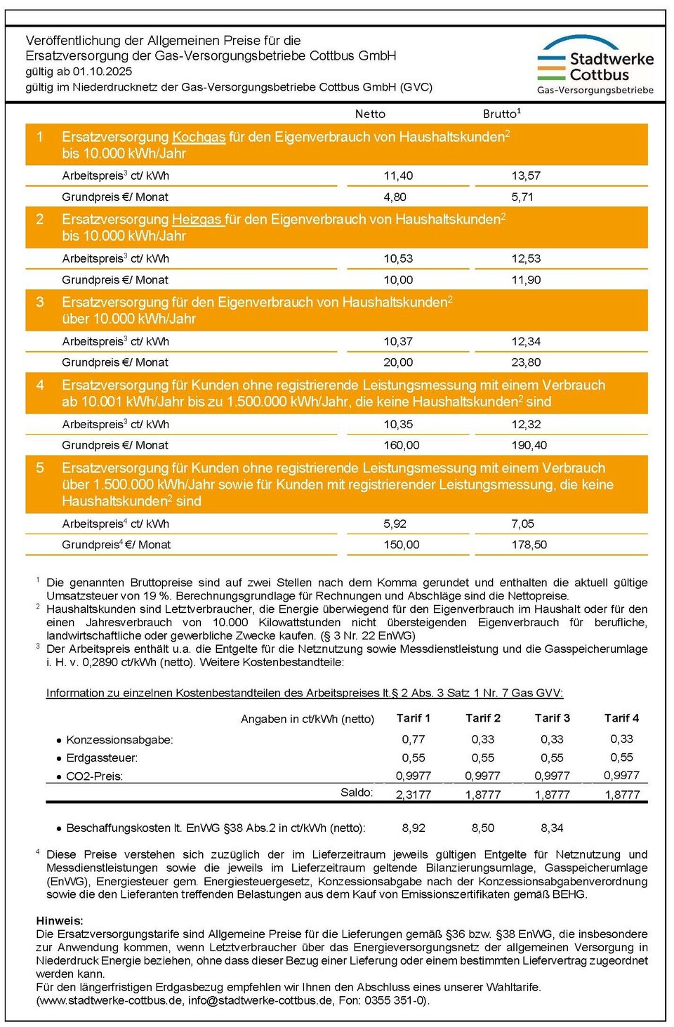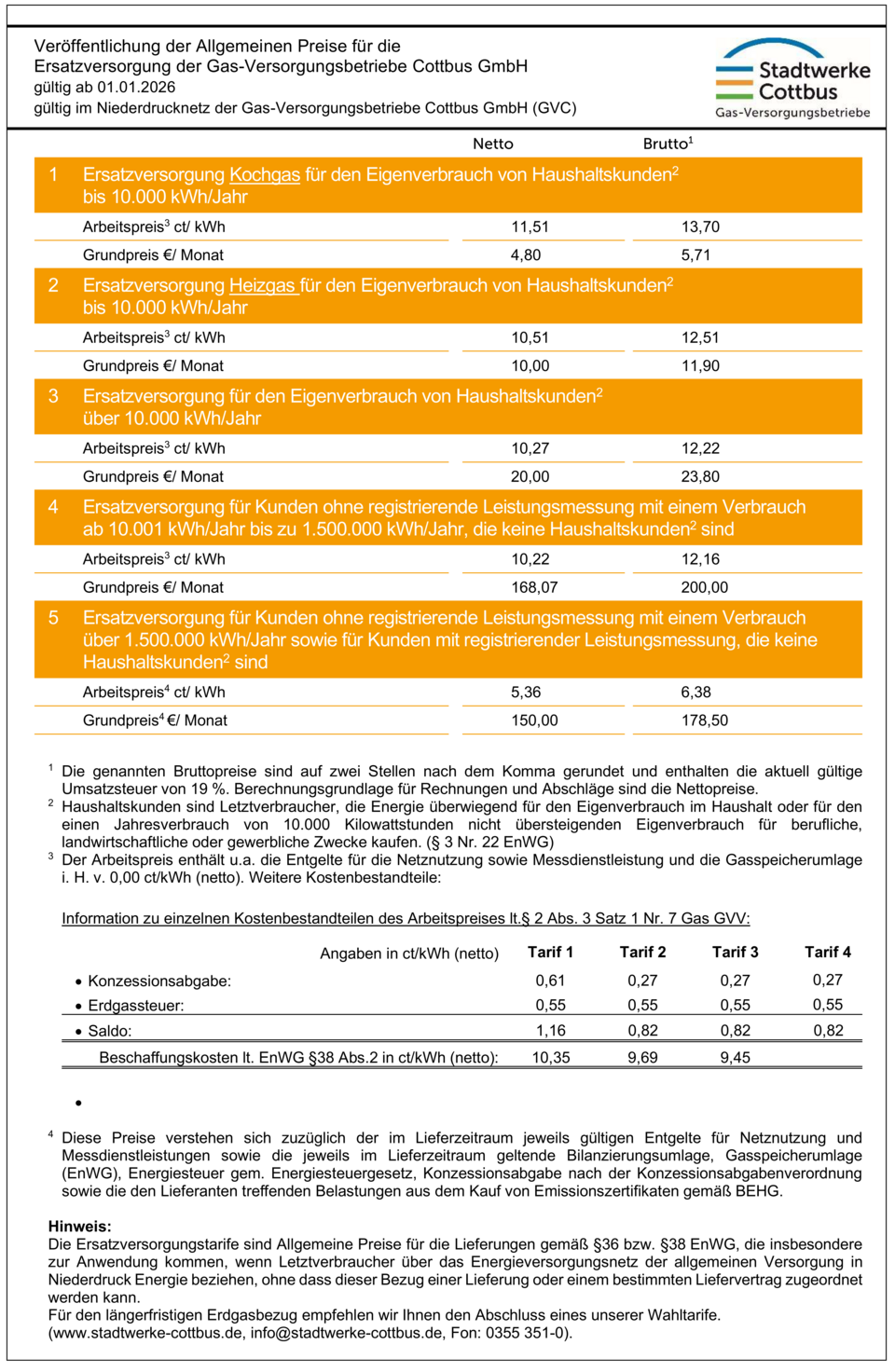 Diese Tarife gelten für Kunden, die Erdgas verbrauchen, ohne mit der Gas-Versorgungsbetriebe Cottbus GmbH oder einem anderen Gasversorgungsunternehmen einen Liefervertrag abgeschlossen zu haben.