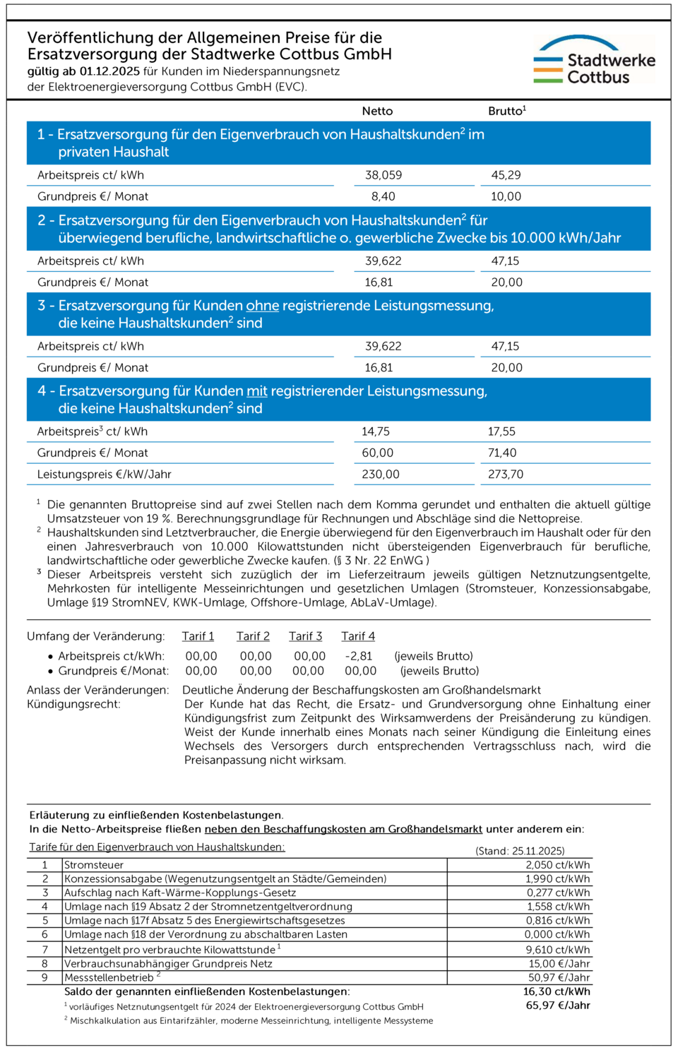 Diese Tarife gelten für Kunden, die Elektroenergie verbrauchen, ohne mit der Stadtwerke Cottbus GmbH oder einem anderen Stromversorgungsunternehmen einen Liefervertrag abgeschlossen zu haben.