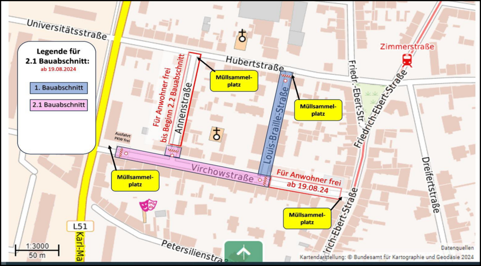 Nun werden die Arbeiten in den nächsten Abschnitt verlagert. Ab dem 19.08.2024 wird die Virchowstraße zwischen der Kreuzung Louis-Braille-Straße und der Karl-Marx-Straße gesperrt. Die Louis-Braille-Straße bleibt weiterhin gesperrt und die Annenstraße wird zur Sackgasse, die von der Hubertstraße aus befahrbar ist.